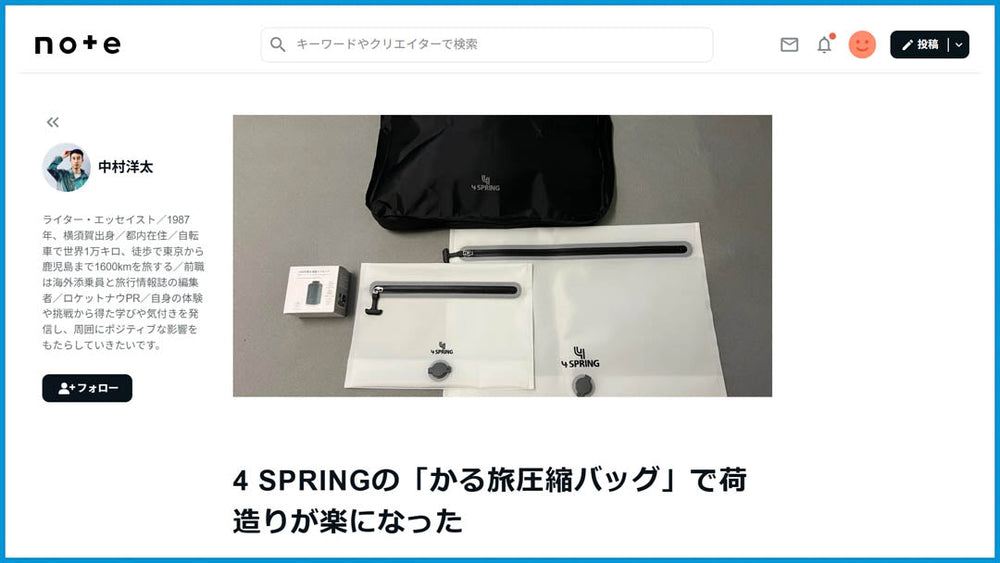 「かる旅圧縮バッグ」新モデルが旅行ライター・中村洋太さんの note で紹介されました!