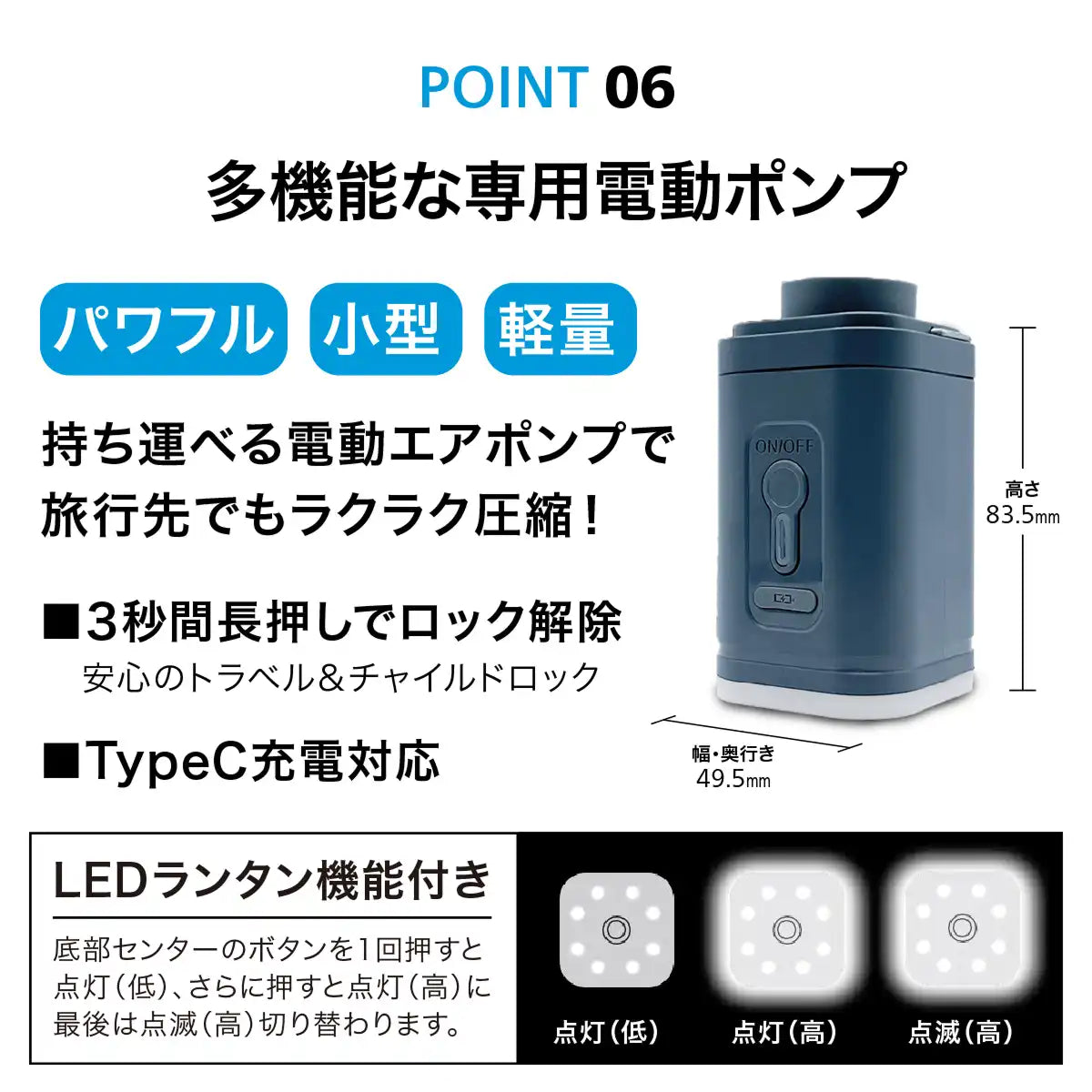 ■ 小型軽量な専用電動エアポンプ対応
